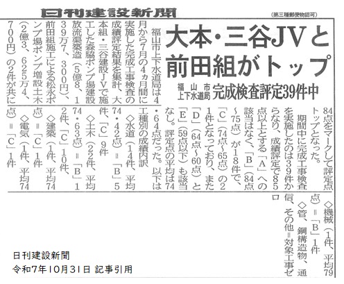 4月から7月の4カ月間に実施した完成工事検査にて,大本組・三谷建設JVの工事現場と弊社・前田組が39件中トップの点数になり,日刊建設新聞にも掲載されました。