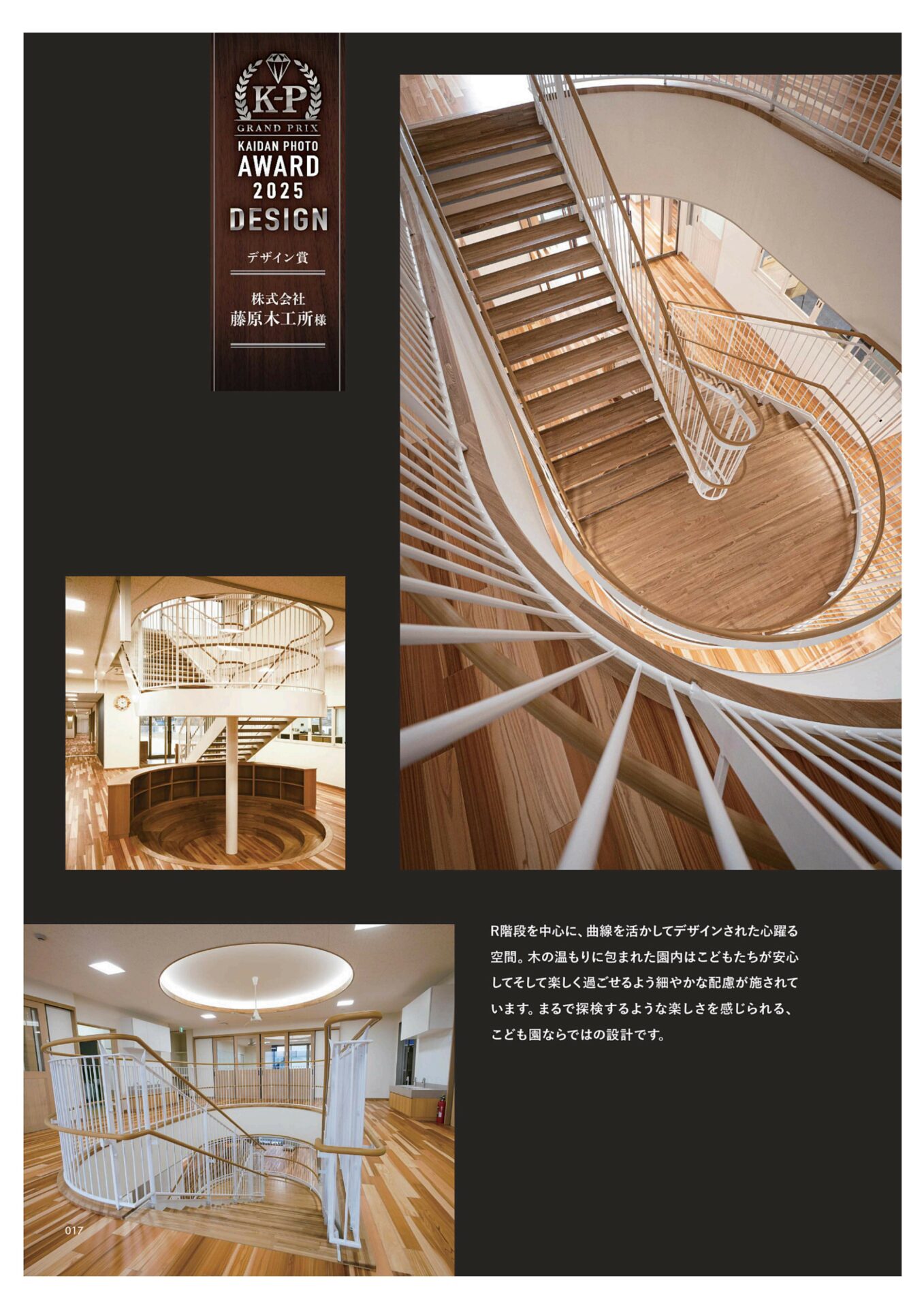 昨年竣工した「こども園のとはら」にて、協力会社の藤原木工所様が制作した階段が、